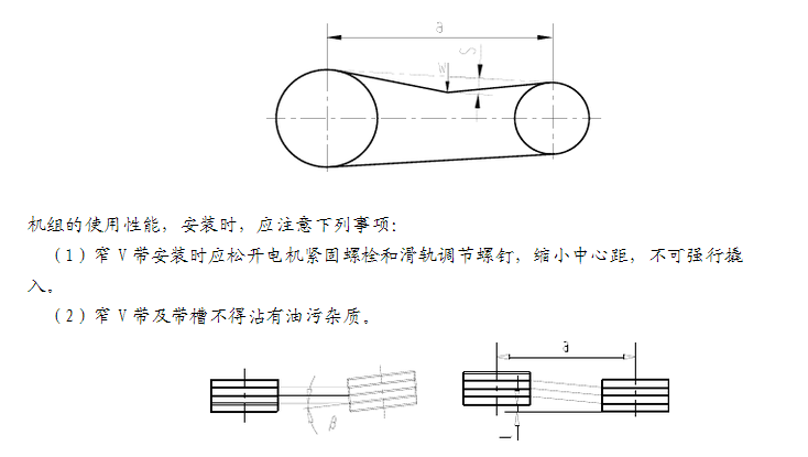 給定外力W垂直作用在窄V帶上側中點處,當產生的撓度滿足: S=0.016a (mm)時,即表示窄V帶張力適中,W值在211.7~270.5N的范圍,以取中間值為宜。 (4)用直尺或調線檢查二帶輪之間的位臵,如下圖所示,調整好后各帶輪軸線應相互平行,帶輪對應輪槽的對稱平面應重合,其偏差β≤20’,l≤1.6a/1000。 (5)安裝調整好后,電機聯接螺栓及滑軌調節螺釘必須呈緊固狀態。