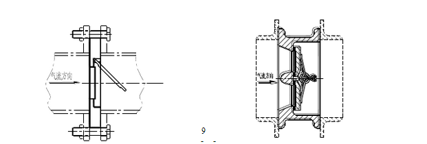 逆止閥必須安裝在水平管道上,安裝時,應使閥片的旋轉軸呈水平方向,并特別注意介質的流向(如下圖所示)。